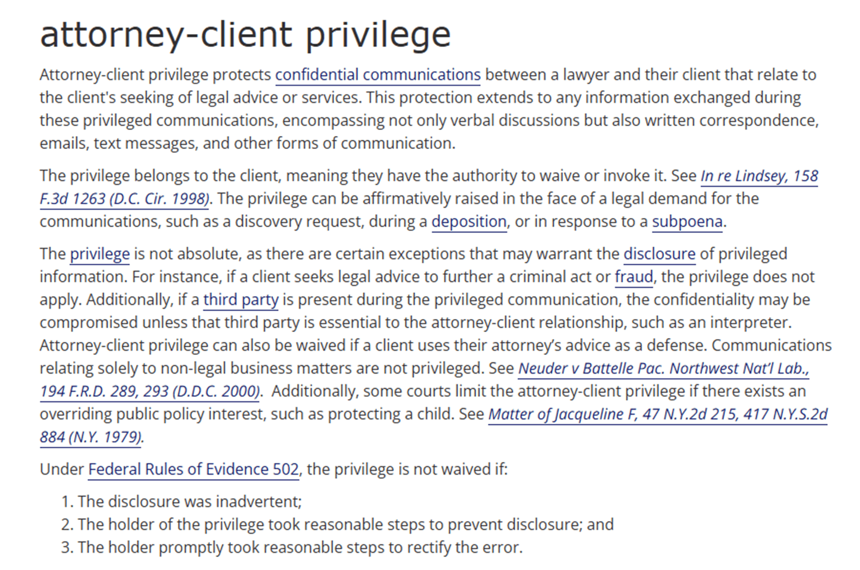 법률 실무에서 기본 전제 중 하나는 변호사-의뢰인 비밀보호 특권(Attorney-Client Privilege)입니다.