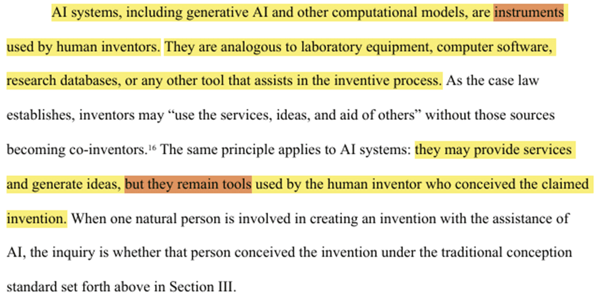 핵심: AI를 활용한 발명도 특허를 받을 수 있지만, 명세서에 기재된 각 청구항마다 최소 한 명의 자연인이 '실질적 기여(Significant Contribution)'를 해야 한다고 규정했습니다.