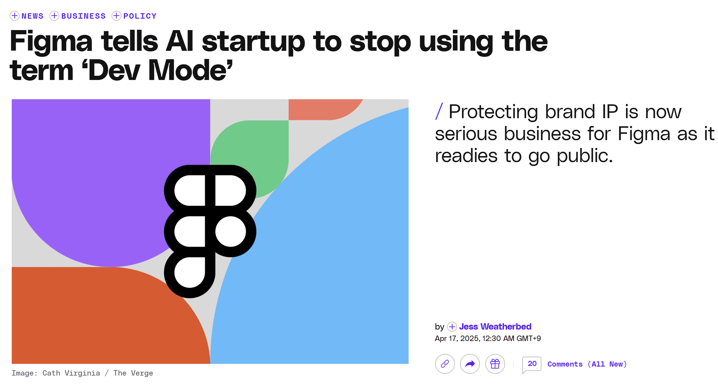 디자인 협업 소프트웨어 기업 Figma가 스웨덴 AI 스타트업 Lovable에 ‘Dev Mode’라는 표현을 쓰지 말라는 내용의 경고장을 보낸 사실이 알려지면서, 기능명과 상표권의 관계가 업계의 화제가 됐습니다.