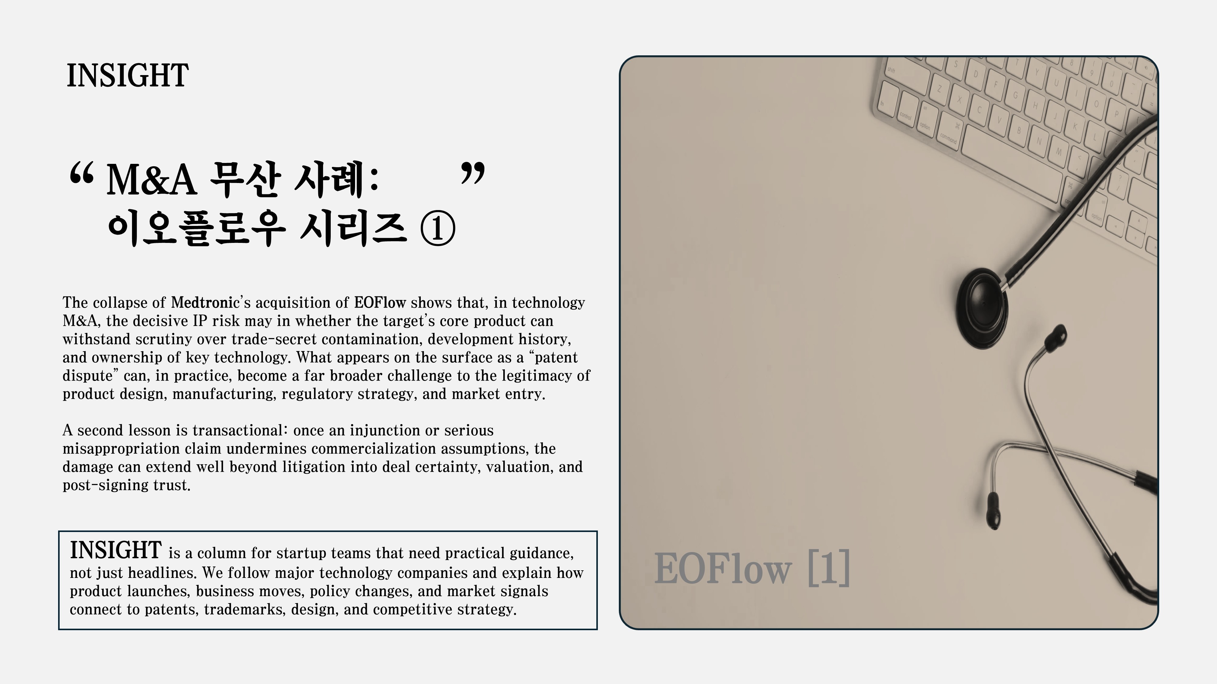이전 칼럼에서는, 이오플로우와 메드트로닉 M&A 무산 과정을 사실관계에 따라 정리하고, 그 과정에서 발생한 IP 리스크가 무엇이었는지를 IP 전문가이자 투자자의 관점에서 살펴보았습니다.