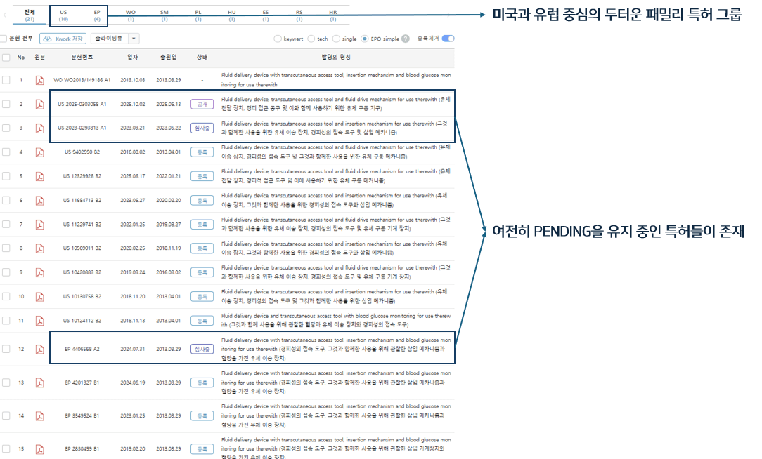 그리고, 인슐렛은 해당 특허 발명에 대해 여전히 미국과 유럽 위주로 지속적인 패밀리 특허 확장을 진행하고 있습니다. 분할출원/CA 출원 등을 이용한 포트폴리오 구축 전략은 이전의 포트폴리오 전략 칼럼과 CA/CIP 노트에서 자세히 다룬 바 있습니다.