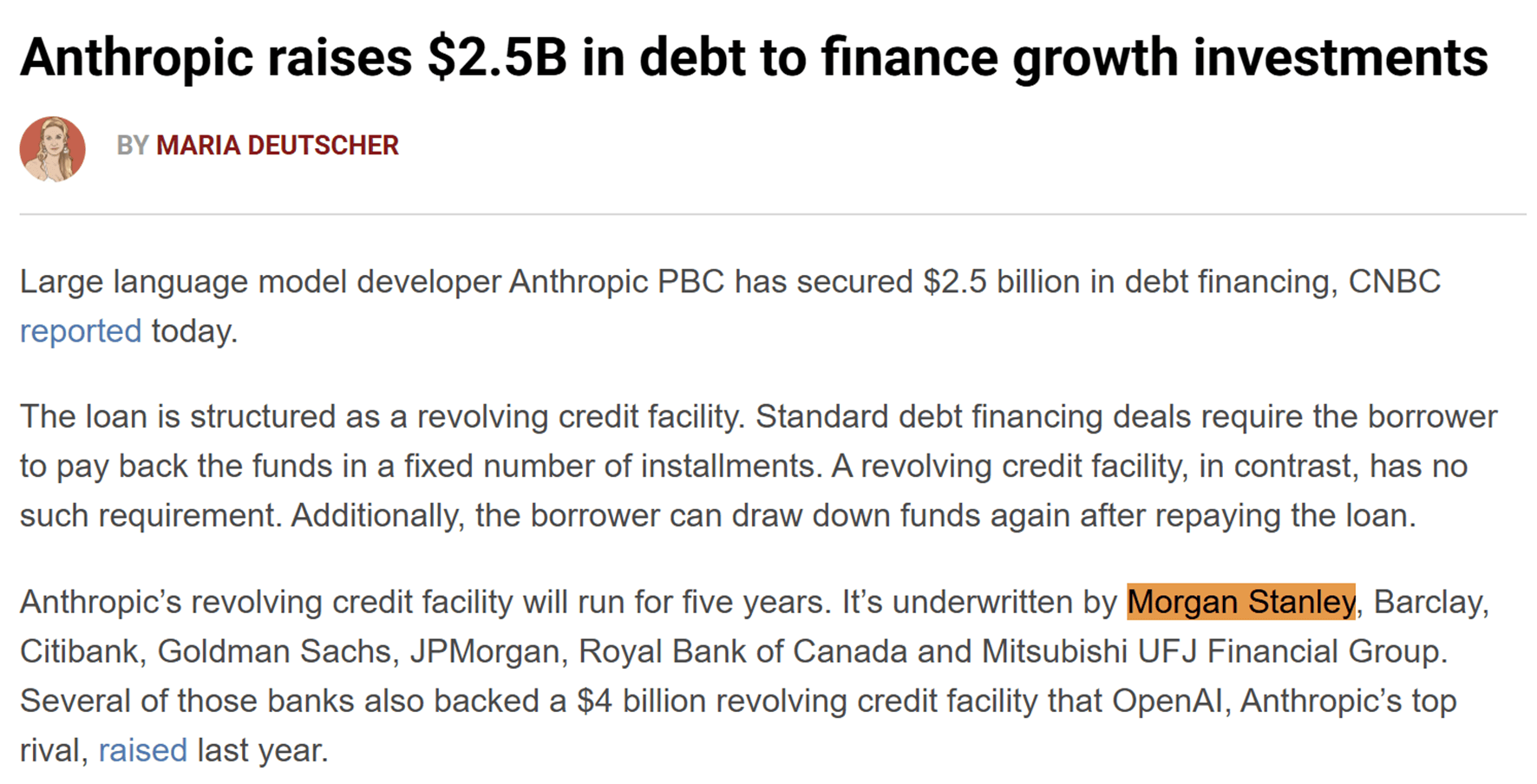 2025년 5월 중순, 외신(CNBC, Reuters 등)은 앤스로픽이 모건 스탠리를 포함한 주요 은행단으로부터 25억 달러 규모의 회전 신용 한도(Revolving Credit Facility)를 확보했다고 보도했습니다.