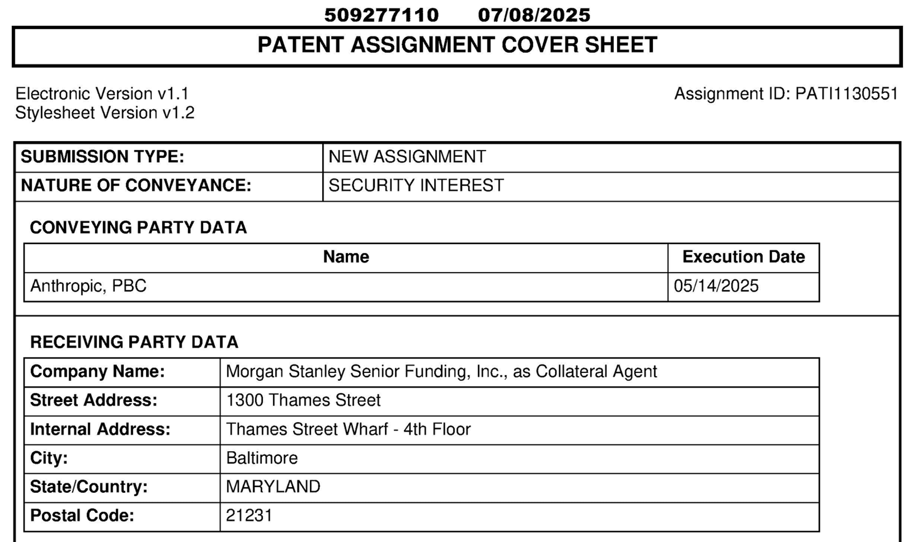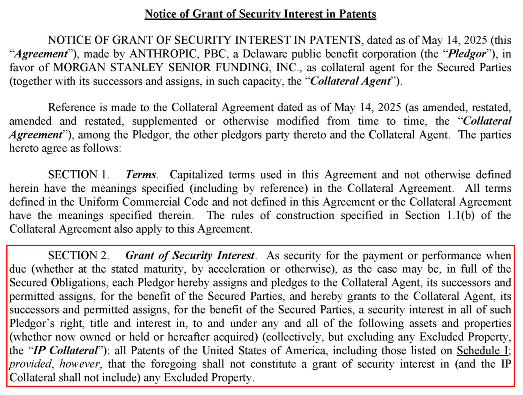 특허 양수 계약 체결로부터 정확히 일주일 뒤인 2025년 5월 14일, 앤스로픽은 모건 스탠리(Morgan Stanley)를 담보 관리인으로 하여 해당 특허들에 대한 담보권(Security Interest) 설정 통지서를 제출합니다.