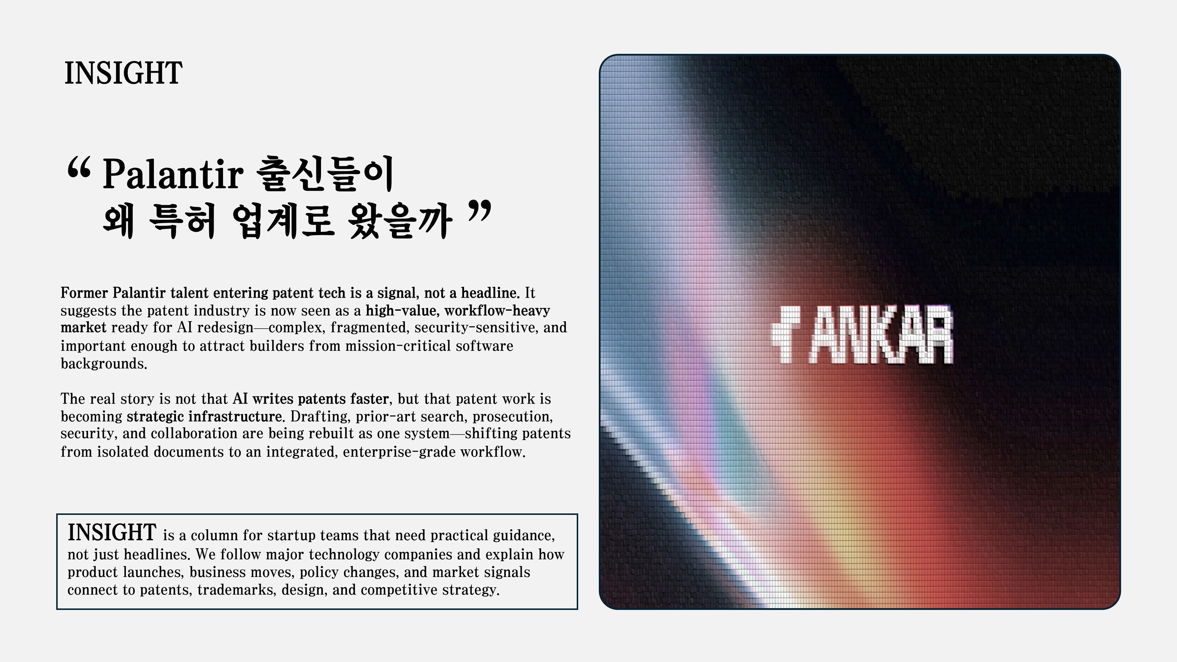 이 지점은 스타트업, AC, VC 입장에서 꽤 흥미롭습니다. 왜냐하면 Palantir류의 인재가 들어오는 시장은 대개 “오래됐지만 복잡하고, 중요하지만 비효율적이며, 데이터와 워크플로우가 파편화된 산업”인 경우가 많기 때문입니다. Ankar 사례는 특허 업계가 이제 그런 재설계의 대상이 되고 있다는 신호로 읽을 수 있습니다. Ankar의 흥미로운 포인트는 특허를 자동화하겠다는 선언 자체가 아니라, 특허가 이제 AI 인프라 관점에서 다시 보이기 시작했다는 점에 있습니다.