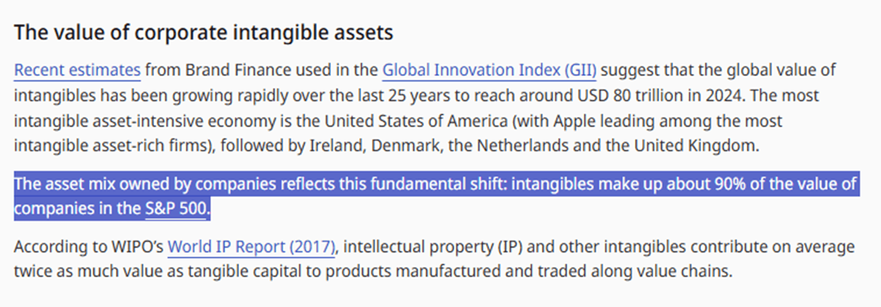 WIPO 역시 S&P 500 기업가치의 약 90%가 무형자산이라고 설명하면서, IP와 기타 무형요소가 현대 기업가치의 핵심을 이룬다고 정리합니다. 즉 이 수치는 “특허가 전부다”라는 뜻이 아니라, 기업가치를 설명하는 방식 자체가 달라졌다는 점을 보여주는 지표로 읽는 것이 더 정확합니다.
