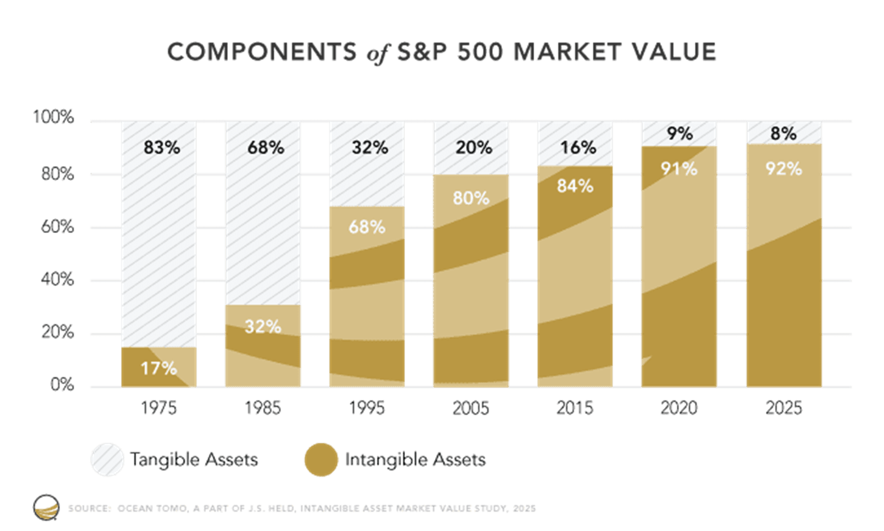 Ocean Tomo의 2025년 자료에 따르면, S&P 500 기업의 시장가치에서 무형자산이 차지하는 비중은 1975년 17%에서 2025년 말 약 92%로 커졌습니다. 반대로 유형자산 비중은 83%에서 8% 수준으로 줄었습니다.