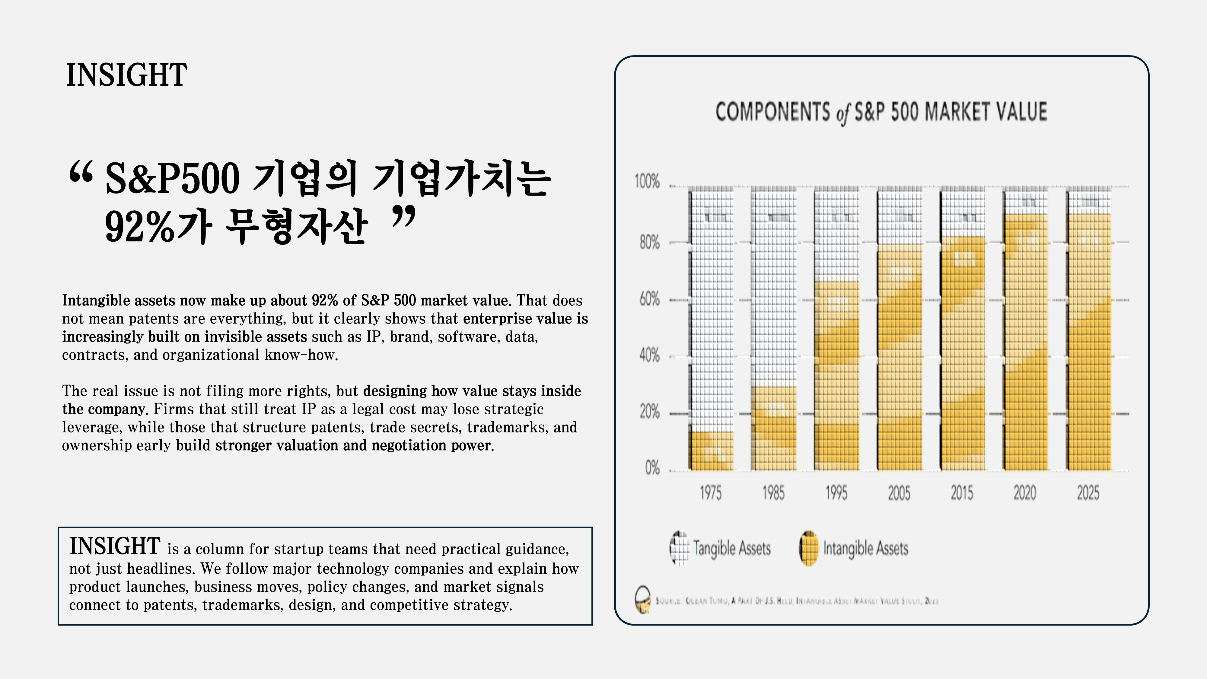 기업가치를 이야기할 때 우리는 여전히 매출, 인력, 설비, 자금조달 같은 눈에 보이는 요소에 익숙합니다. 그런데 정작 시장이 평가하는 가치의 무게중심은 오래전부터 다른 곳으로 이동하고 있습니다. Ocean Tomo의 2025년 자료에 따르면, S&P 500 기업의 시장가치에서 무형자산이 차지하는 비중은 1975년 17%에서 2025년 말 약 92%로 커졌습니다. 반대로 유형자산 비중은 83%에서 8% 수준으로 줄었습니다. Ocean Tomo는 이 변화를 가치 창출의 중심이 ‘손에 잡히는 것’에서 ‘생각되고 설계되는 것’으로 이동한 현상으로 설명합니다.