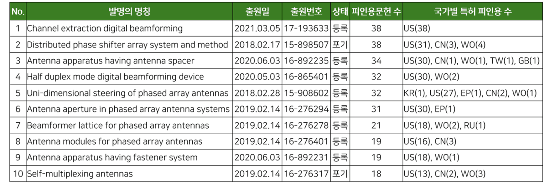 아래는 스페이스X 미국 특허 가운데 피인용문헌 수가 높았던 10건을 정리한 것입니다.