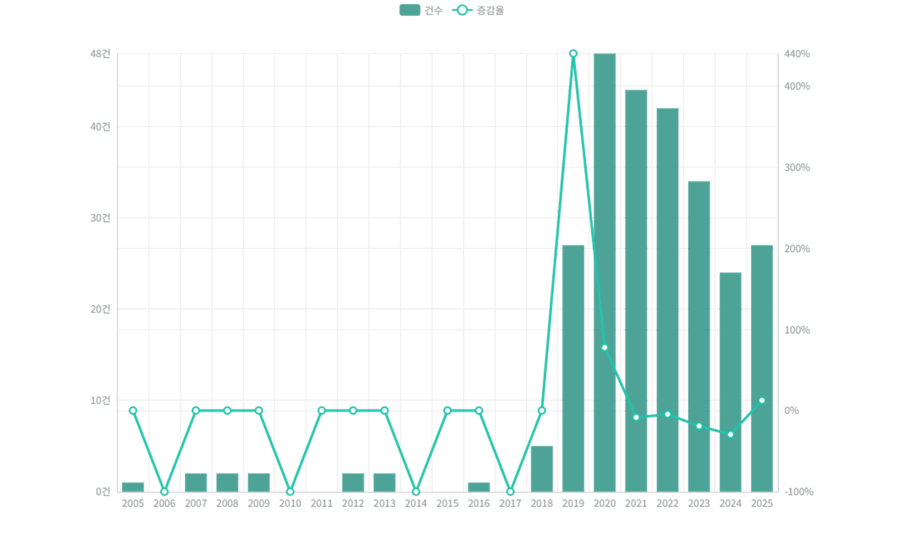 2018년 이후 스페이스 X의 특허 출원이 급증하는 것을 확인할 수 있습니다.
