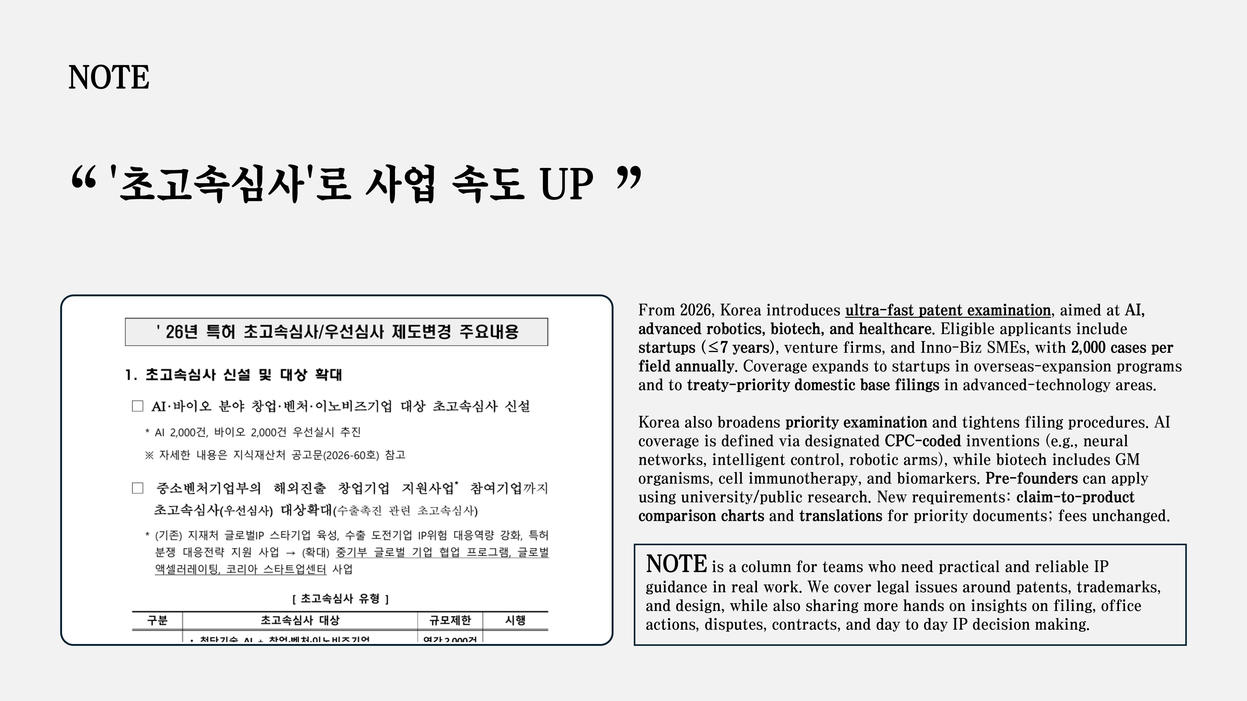 2026년부터 새롭게 시행되는 '초고속심사'와 '우선심사' 확대 소식을 정리해 드립니다. 우리 회사가 해당되는지 꼭 확인해 보세요! 주요 변화는 크게 세 가지 방향으로 요약됩니다: ① 첨단기술(AI·바이오) 지원 강화, ② 창업 및 해외 진출 기업 대상 확대, ③ 신청 절차의 체계화입니다.